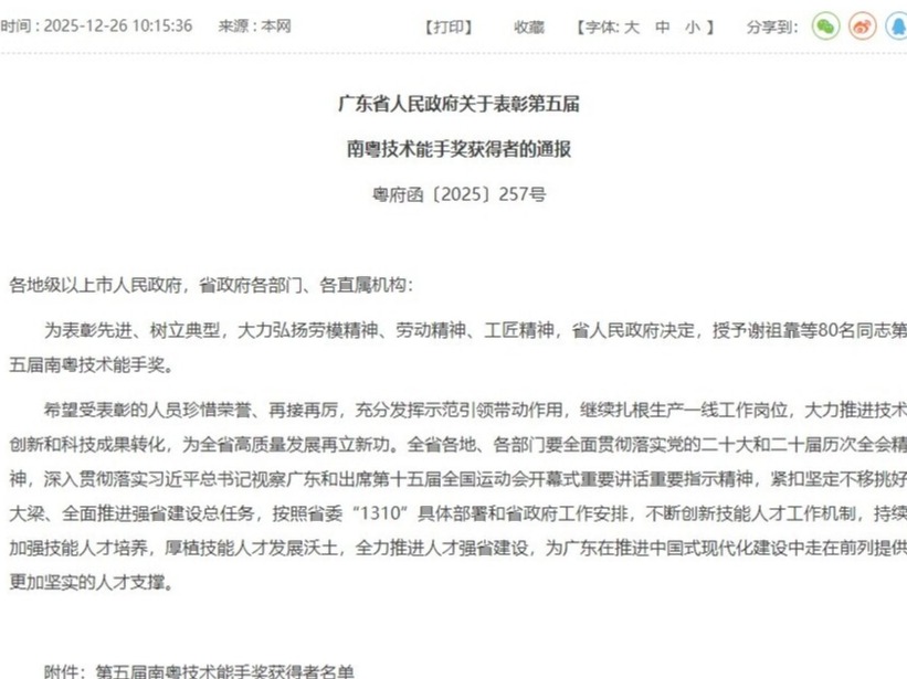 广东省人民政府关于表彰第五届南粤技术能手奖获得者的通报于2025年12月公布。“南粤技术能手”是经广东省委、省政府批准,对技能人才专门设立的最高荣誉,每四年评选一次,获奖人员均为全省各行各业生产一线的技能标杆。其中,来自工艺美术行业的丁全、郑国柳、郭少俊、何世良四位从业者荣获此奖项。