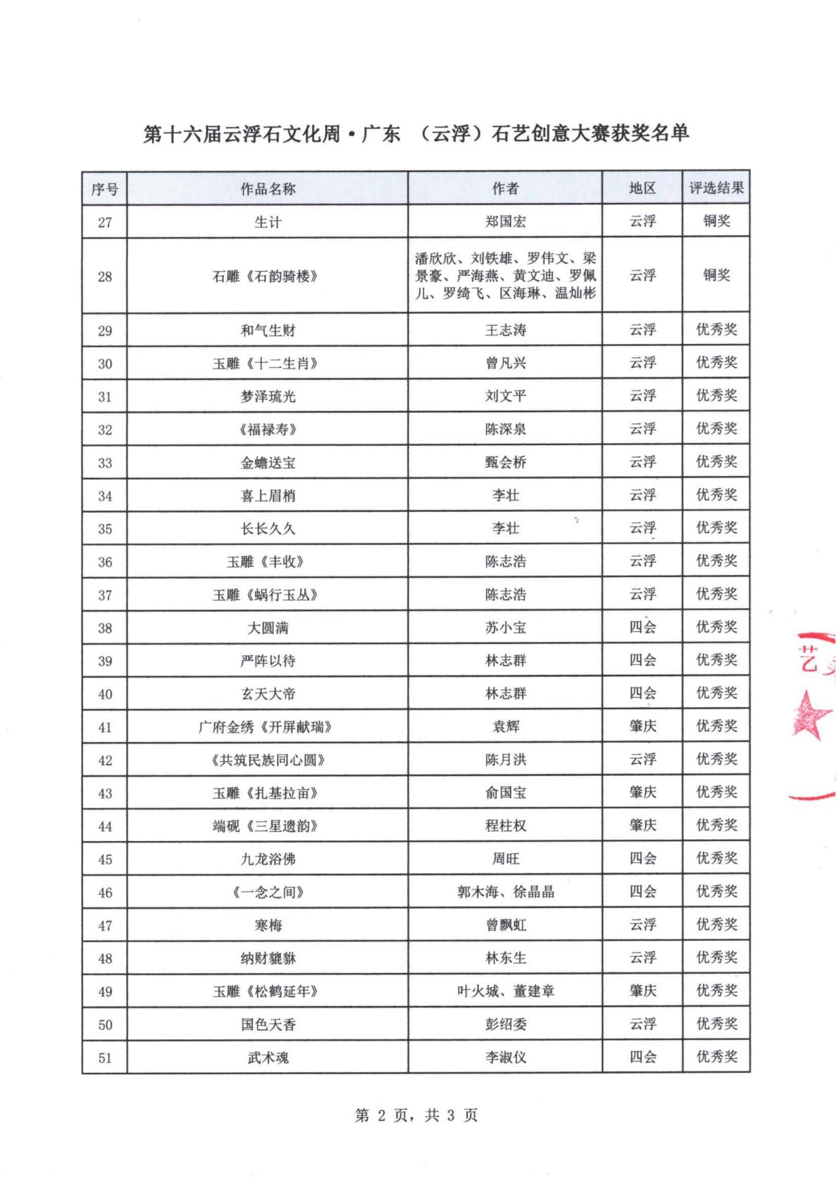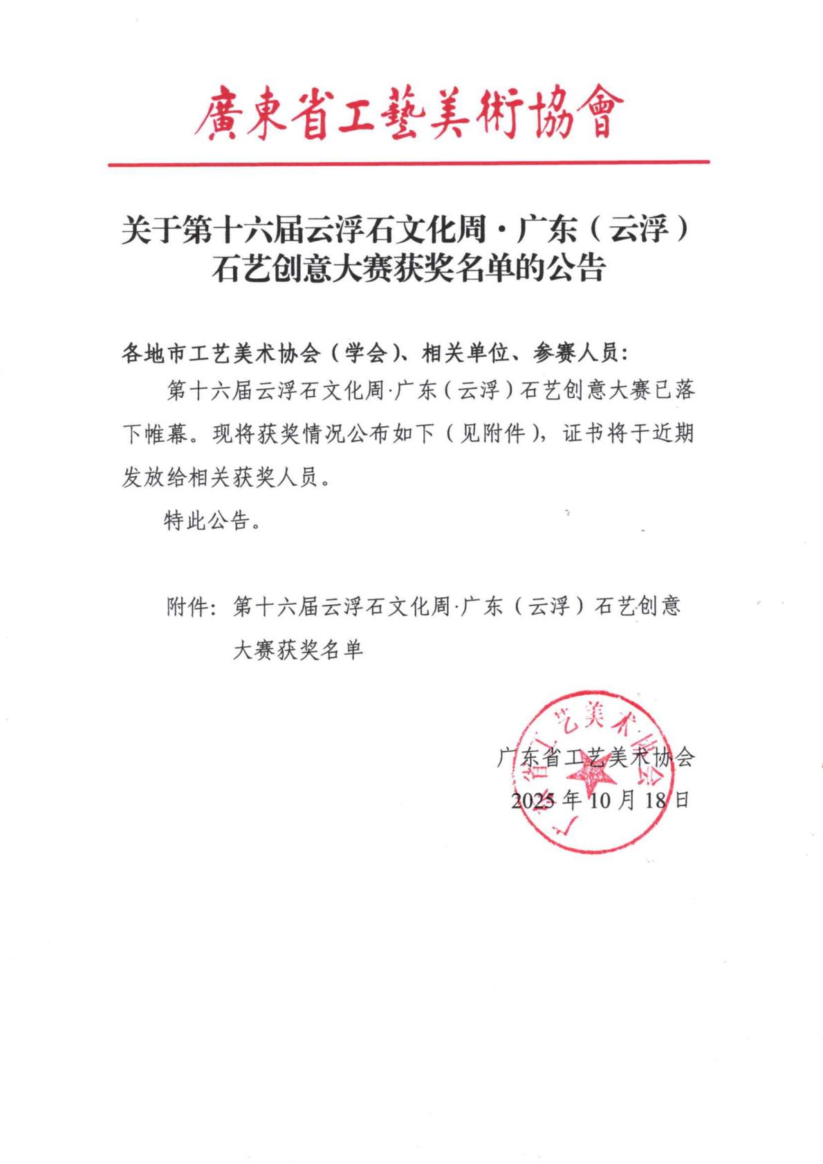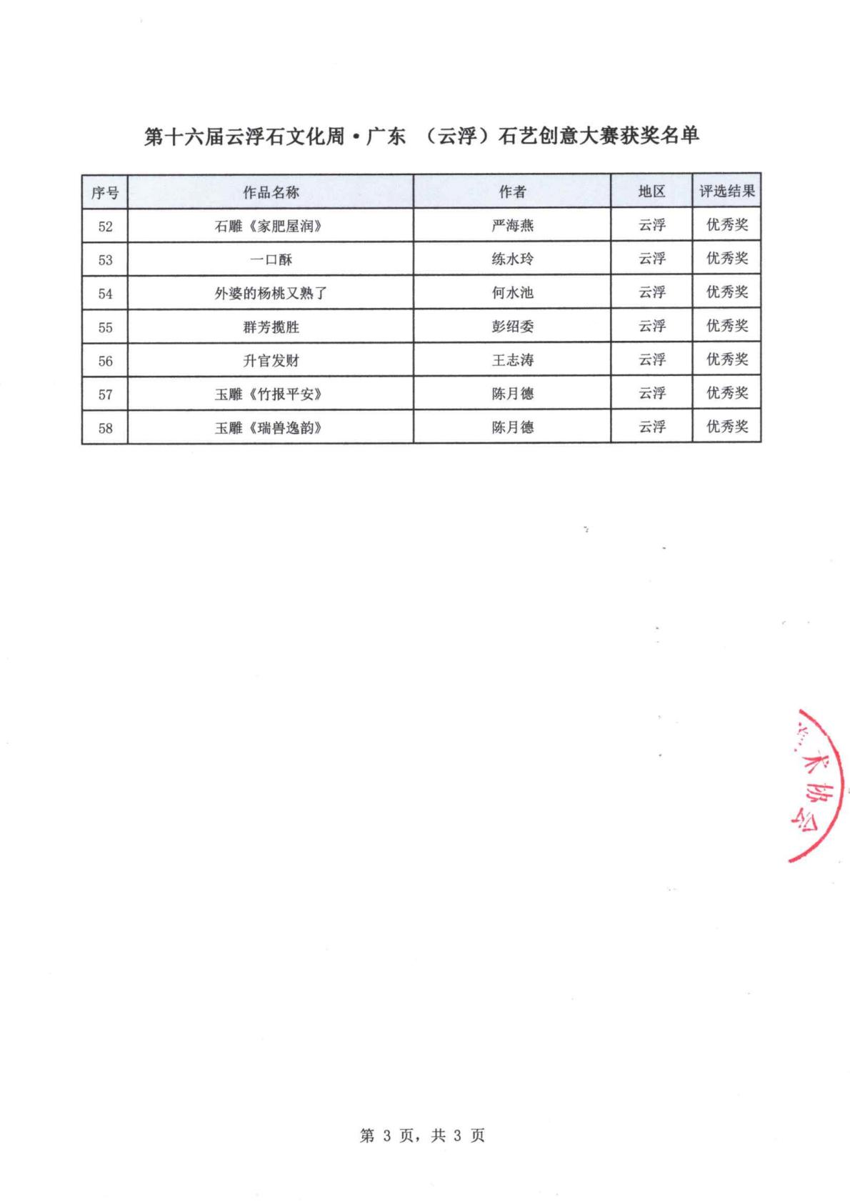 关于第十六届云浮石文化周·广东 (云浮)石艺创意大赛获奖名单的公告